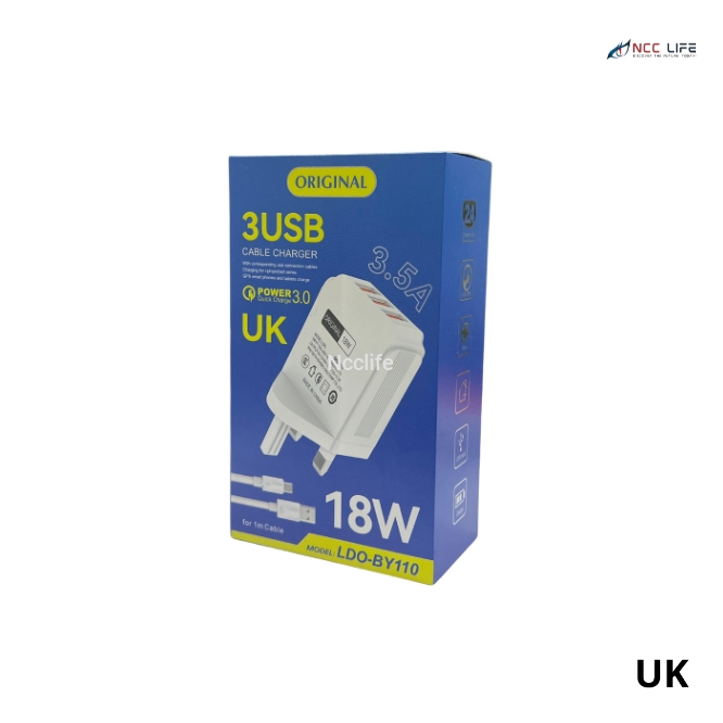 The LDO-BY110 is a versatile fast charger designed for multiple device compatibility. With its 3 USB output ports, this charger allows you to power multiple devices simultaneously. It supports Micro, Type-C, and Lightning cables, making it an ideal charging solution for smartphones, tablets, and other gadgets. Built with durable PC material and engineered for safety, it ensures reliable and efficient charging.