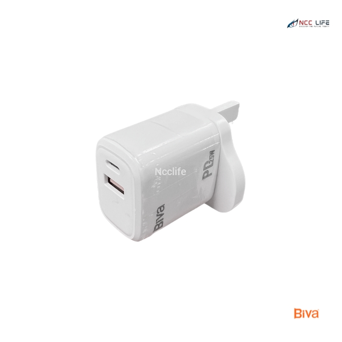 The BIVA PD+QC3.0 Fast Charger 25W (Model HC-49) is designed to deliver high-speed charging for Type-C to Lightning devices, offering a reliable and efficient solution for smartphones and tablets. With Power Delivery (PD) up to 25W and Qualcomm Quick Charge 3.0 (QC3.0) support, this charger ensures rapid and safe charging. Crafted from durable ABS material, it also provides protection against overheating and overcharging. Ideal for users who need fast and efficient charging, it features Type-A and Type-C output interfaces, making it versatile for a variety of devices.