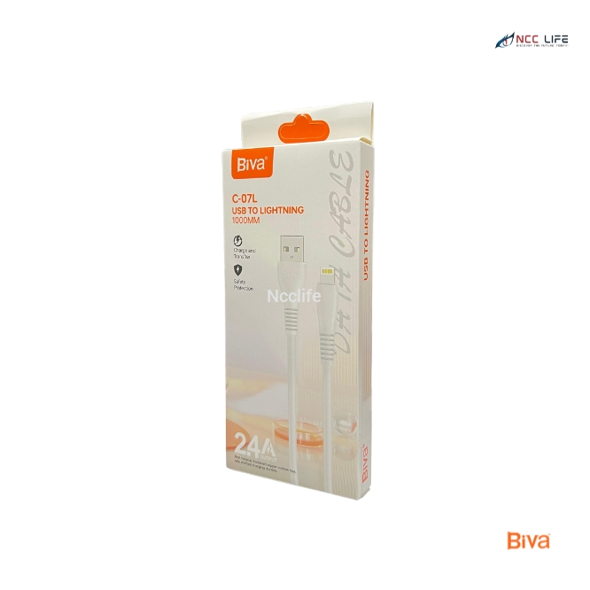 The BIVA USB to Lightning Data Cable (Model C-07L) is a durable and efficient charging and data transfer cable designed for iPhones and other Lightning-compatible devices. Made from real, thickened copper core, this 1-meter cable ensures minimal energy loss and supports fast charging up to 2.4A. Whether you're charging your device or syncing data, this cable provides a stable, fast, and safe connection. Its durable design guarantees long-lasting use, while built-in safety protection helps prevent overheating and overcharging, ensuring safe usage.