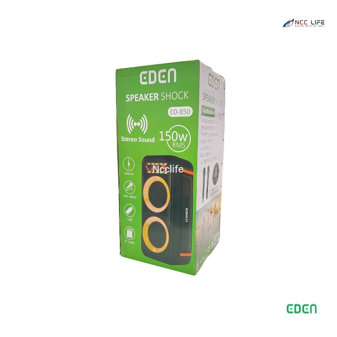 Bring power to your party with the EDEN ED-850 Partybox Speaker, boasting a strong 150W RMS output and dual 8" woofers paired with 2.5" tweeters for full-range sound. Equipped with Bluetooth 5.0 and TWS (True Wireless Stereo) capabilities, this speaker also includes inputs for AUX, USB, TF Card, and even a guitar for live performances. With an IPX4 waterproof and dustproof design, it’s perfect for both indoor and outdoor settings. The long-lasting 18.5V/4000mAh battery supports up to 8 hours of playtime, and the Type-C USB charging port ensures fast recharging. Customize your sound with bass, treble, mic volume, and echo controls, and enjoy LED lights to set the mood.