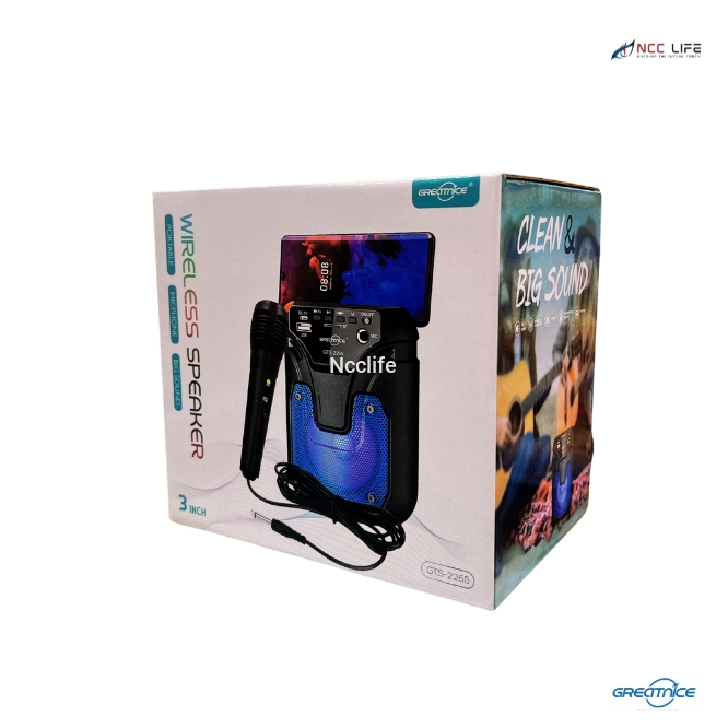 Enjoy high-quality audio and karaoke fun anywhere with the Great Nice Portable Karaoke Bluetooth Speaker GTS-2265. This compact 3-inch speaker comes with a wired microphone, making it ideal for singing, announcements, and parties. With Bluetooth connectivity, multiple input options, and a built-in rechargeable battery, you can experience seamless wireless music streaming. The vibrant LED lights enhance the party vibe, while its portable design makes it easy to carry for outdoor and indoor use.