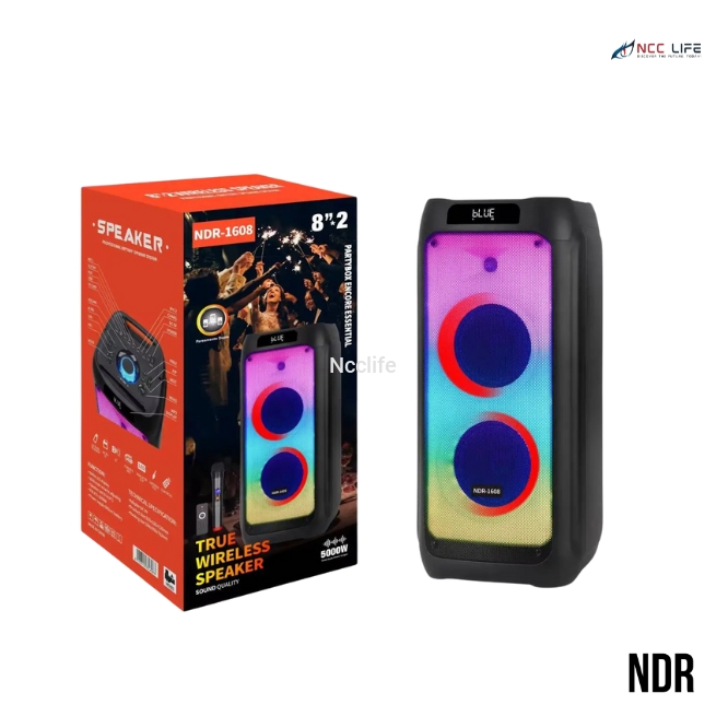 Unleash powerful audio with the NDR 1608 Wireless Karaoke Bluetooth Speaker, equipped with dual 8" woofers to deliver deep bass and clear treble for an immersive sound experience. Whether you’re hosting a party, singing karaoke, or enjoying your favorite tunes, this speaker is built to elevate every moment. With Bluetooth support, a wireless mic, and colorful LED lights, the NDR 1608 is the ultimate entertainment companion.