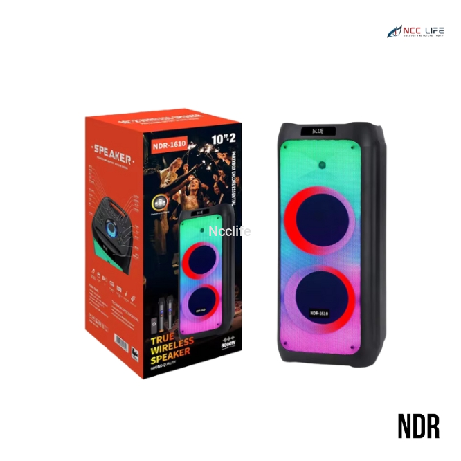 Take your events to the next level with the NDR 1610 Wireless Karaoke Bluetooth Speaker, engineered with dual 10" powerful woofers for room-filling sound and thumping bass. Ideal for parties, karaoke nights, and outdoor gatherings, this speaker combines wireless connectivity, colorful LED lights, and a wireless microphone for the ultimate entertainment experience. Whether you’re singing, hosting, or just vibing to your playlist, the NDR 1610 delivers quality and style.