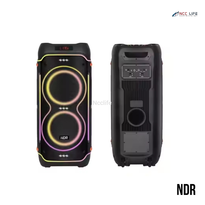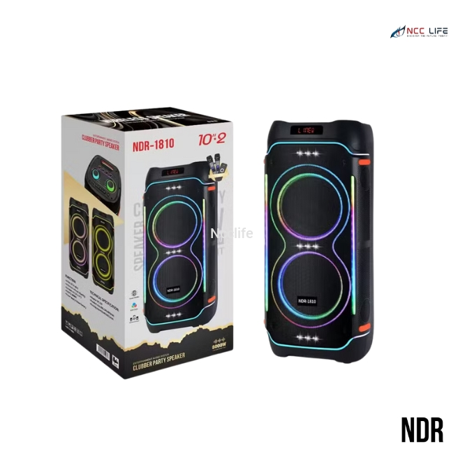 Elevate your party experience with the NDR 1810 Wireless Karaoke Bluetooth Speaker, now with dual 10" inch powerful woofers that deliver booming bass and immersive sound. Ideal for indoor and outdoor use, this speaker includes wireless microphone support, RGB lighting effects, and multiple playback options including Bluetooth, USB, and FM radio. With a sleek design and vibrant lights, it's perfect for karaoke, events, or just enjoying music in high quality.