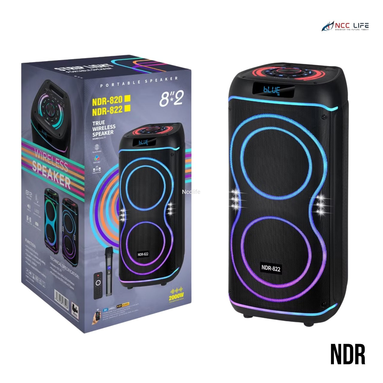Turn up the party with the NDR-822 Dual 8-Inch Bluetooth Party Speaker, built for powerful bass and vibrant sound. With dual 8-inch woofers, wireless connectivity, and colorful LED lighting, it’s the perfect speaker for indoor events, outdoor gatherings, or karaoke nights. Designed to deliver rich audio and energetic vibes wherever you go.