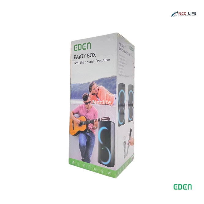 The EDEN ED-1006 Partybox Speaker is designed for dynamic, high-powered audio experiences, featuring 100W RMS output with dual 10" woofers and a 1.5" tweeter for clear, impactful sound. With a 12V/4500mAh lead acid battery, this speaker offers long-lasting playtime between 4-9 hours and recharges in 2-4 hours. Bluetooth 5.3 compatibility enables seamless wireless streaming, while multiple inputs, including AUX, USB, TF Card, MIC, and Guitar inputs, expand connectivity options. Enhanced with Disco lighting and MEGA BASS functionality, this speaker is perfect for lively gatherings and live performances.