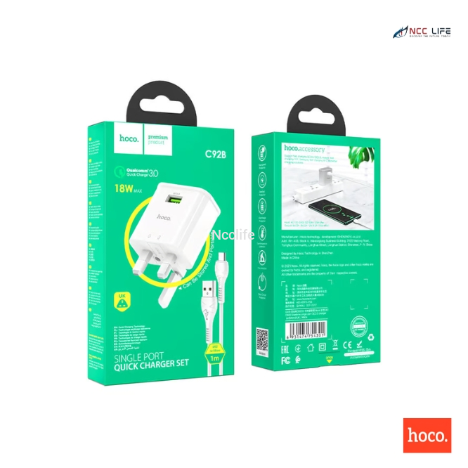 The Hoco 18W Single Port USB Quick Charger Set for Micro USB ensures fast and efficient charging with Quick Charge 3.0/2.0 compatibility. It supports a wide range of devices, including Samsung fast charging models, making it versatile and reliable. Its lightweight and compact design make it ideal for travel or daily use. The charger is equipped with safety features to protect your devices from overcharging and overheating.