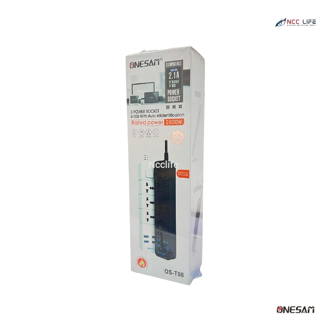 The Onesam OS-T08 Power Socket is a high-performance power strip designed to safely power multiple devices at once. With a 2500W capacity, it supports high-power appliances while ensuring overload and surge protection. The 2-meter durable cable provides flexibility in placement, making it perfect for homes, offices, and workspaces.